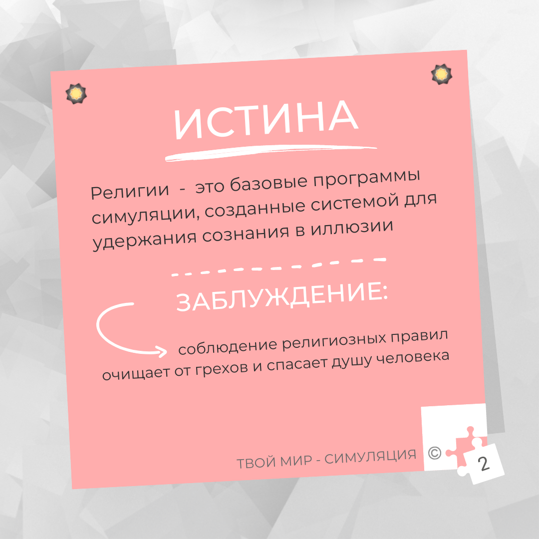 Религии — это базовые программы симуляцииРубрика: Истины и заблуждения, Симуляция в симуляции Религии — это базовые программы симуляции. Они созданы системой для удержания твоего сознания в иллюзии. Вера в религиозные догмы блокирует твое сознание и не позволяет тебе понять истину.А истина в том, что весь твой мир — симуляция Было полезно?! - Буду благодарен за донат Для связи и предложений используйте каналы: Youtube Tiktok Instagram Twitter Facebook Telegram People-arrows